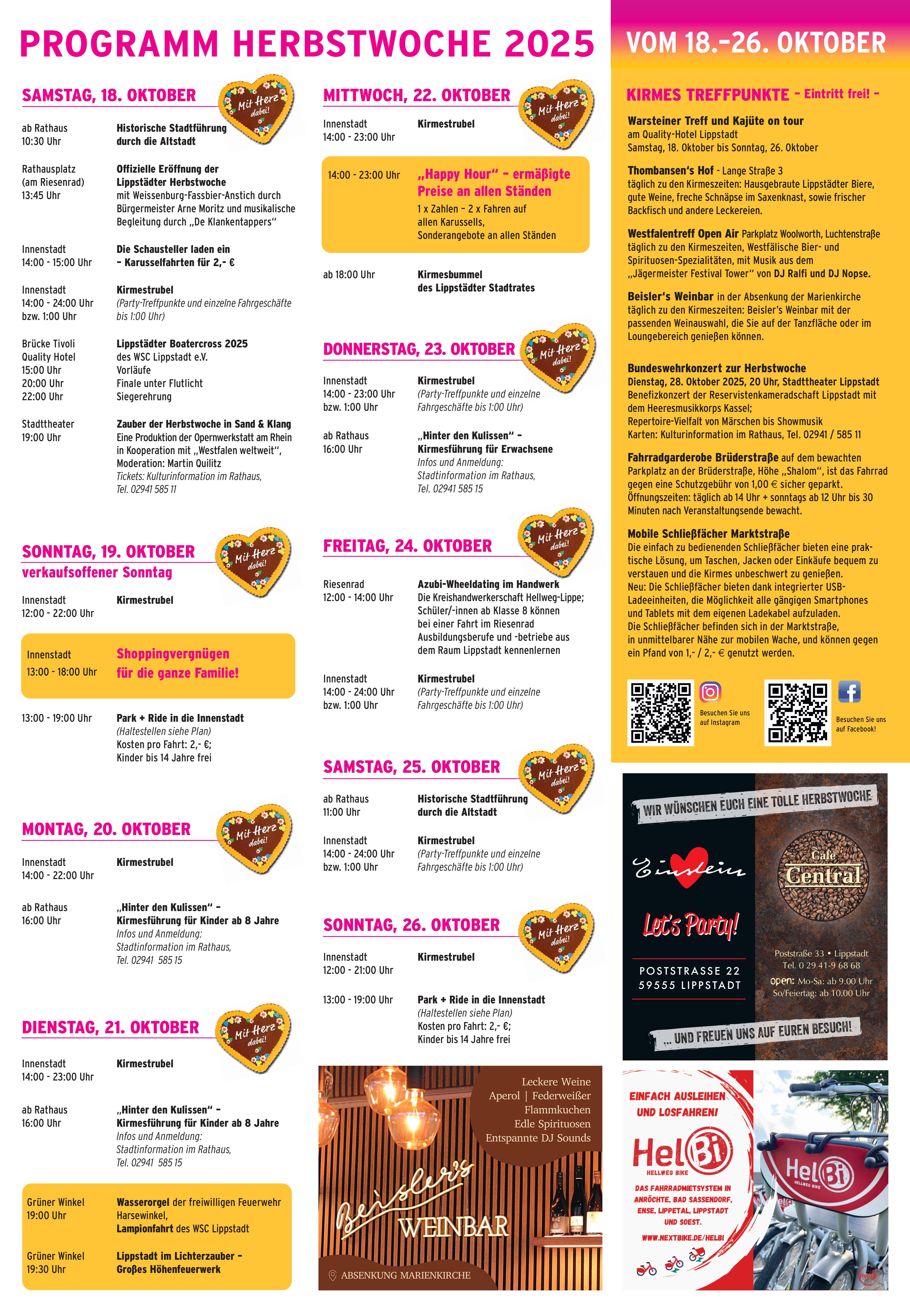 Die Herbstwoche in Lippstadt findet jährlich in der Innenstadt von Lippstadt statt und zieht tausende Besucher aus der Region und darüber hinaus an. Sie bietet eine Kombination aus traditioneller Kirmes, Jahrmarkt und städtischem Volksfest. Es gibt zahlreiche Fahrgeschäfte, Buden und Stände mit Speisen, Getränken, und typischen Kirmes-Attraktionen. Sie ist besonders bei Familien beliebt, da es Attraktionen für jede Altersgruppe gibt – von Kinderkarussells bis hin zu spektakulären Fahrgeschäften für Adrenalinliebhaber.